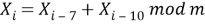 В данном алгоритме каждое последующее число является тем, которое было сгенерировано 7 шагов назад, плюс случайное число, которое было сгенерировано 10 шагов назад и деленное по модулю на большее значение