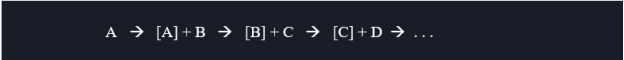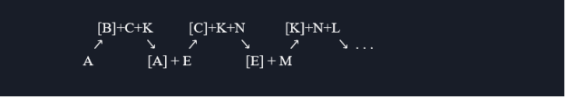 Здесь наборы из активных элементов в квадратных скобках [] обозначают состояние предыдущего шага, а наборы без скобок — текущего шага. Симметричная активация как слева (прямой ход), так и справа(обратный ход) обеспечивает точное восстановление исходного состояния при обратном проходе того же алгоритма, что и при прямом.