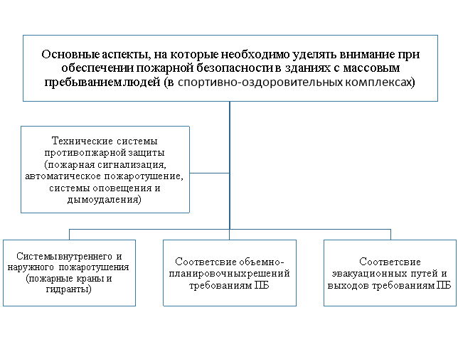 На рисунке 1 изображены основные аспекты, на которые необходимо уделять внимание при обеспечении пожарной безопасности в зданиях с массовым пребыванием людей (спортивно-оздоровительных комплексах).