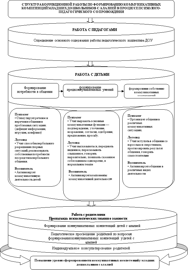 Разработанная нами коррекционная работа коммуникативных компетенций у младших дошкольников с алалией в процессе психолого-педагогического сопровождения представлена как система психолого-педагогических, психокоррекционных и логопедических мероприятий, предполагающих специальную группировку наиболее приемлемых форм, приемов и методов, нацеленных на формирование и развитие коммуникативных компетенций у детей с алалией младшего дошкольного возраста в детских садах для детей с нарушениями речи.