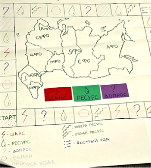 Шанс – участник вытягивает карточку шанс и получает положительный или отрицательный эффект в развитии своего региона (прибавка или убытие баллов). Например, в вашем регионе обнаружено месторождения алмазов (+ 50 баллов) или в вашем регионе был неурожайный год (- 50 баллов).