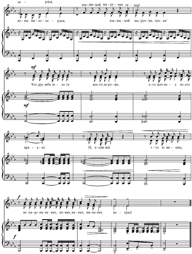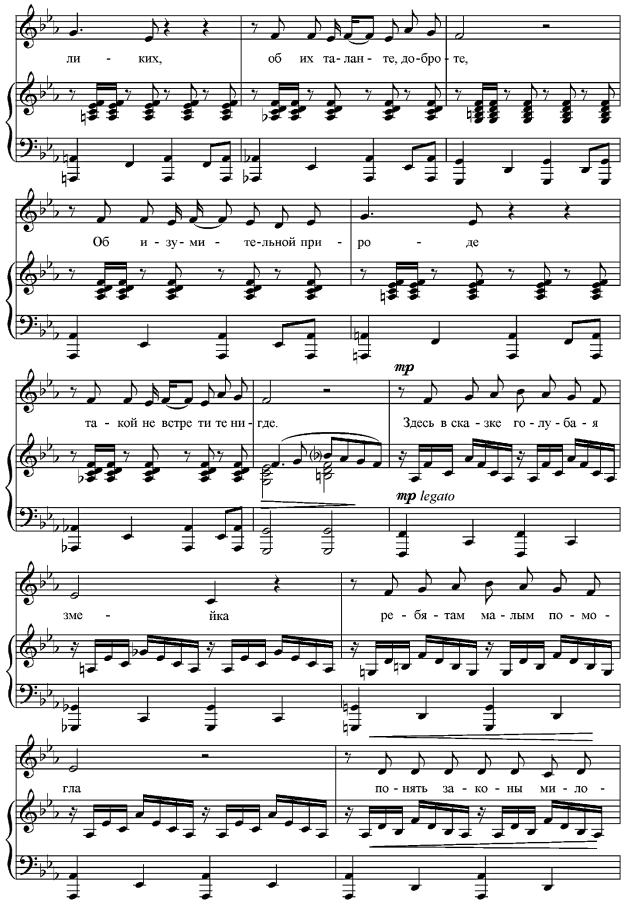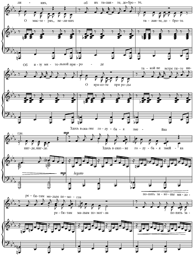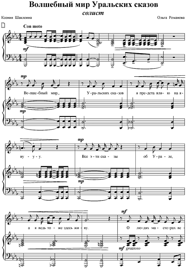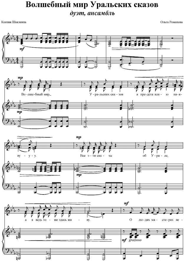 В качестве примера предлагаем вам сольный вариант песни «Волшебный мир Уральских сказов» сл. К. Шаклеиной, муз. О. Романовой и обработку для вокального ансамбля.