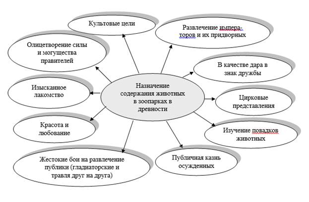 Обобщая вышесказанное из проведенного экскурса в историю зоопарков, можно выделить основные задачи содержания животных в зоопарках в древности (рис. 2). Как видно из рисунка 5, задачи современного зоопарка кардинально отличаются от предназначения содержания животных в древности, что говорит о разном отношении и восприятии человечества к животному миру.