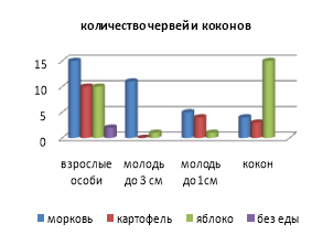 Для эксперимента нами были подготовлены 4 одинаковых емкости. В 3 емкости был положен разный корм, одинаковой массы — картофель, морковь, яблоко, 1 емкость оставили без добавления корма. Все 4 емкости поместили в аквариум и засыпали почвой выше кромки емкостей на 5 см для того чтобы черви могли свободно перемещаться. Сверху на почву были помещены 37 взрослых особей красного-калифорнийского червя и 15 молодых червячков размером до 1 сантиметра. Аквариум поставили в темное место на 10 дней (т. к. в литературный источниках написано, что откладка коконов происходит раз в 5–7 дней а коконы созревают 2–4 недели) по мере необходимости грунт увлажняли. Через 10 дней все емкости извлекли из аквариума для тщательного осмотра и подсчёта червей и коконов находящихся в них. Вот что у нас получилось