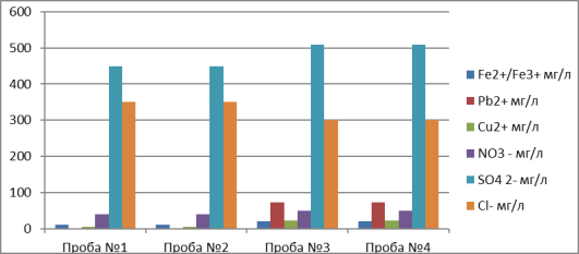 Анализ диаграммы № 1, составленной по таблице № 4 показал, что содержание катионов (особенно ионов свинца) превышает норму в придорожной воде (в предварительно замороженной и не замораживаемой воде), содержание анионов (исключение ионы хлора) немного превышает их содержание, чем в водопроводной воде.