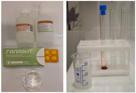 В качестве окислителя в мерный стакан прилили 50 мл перекиси водорода 3 % и растворили в нем 2 таблетки «Галавита». Реакция должна протекать в щелочной среде, поэтому к раствору добавили 3 капли аммиака 10 %. Полученный раствор по 10 мл разлили по трем пробиркам. Поскольку реакция каталитическая, к раствору необходимо добавить ион железа, как катализатор (Рис.1). Эксперимент проводился при стандартных температурных условиях при 250С.