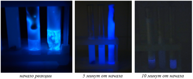 Рис. 2. Хемилюминесценция. На фото в пробирках слева направо в качестве катализатора: производное гемина «Гематоген», железный купорос, кровь человека