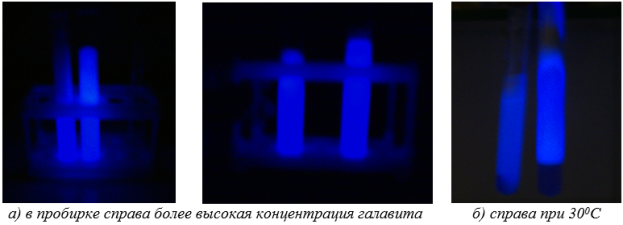 Дополнительно был проведен эксперимент с катализатором — производным гемина, при более высокой концентрации натриевого производного люминола — «Галавита». Яркость свечения и его длительность при более высокой концентрации последнего реагента была выше (Рис. 3а). Затем было исследовано влияние температуры на интенсивность свечения. Две пробирки с одинаковыми составами, как в первом эксперименте, поместили в разные температурные условия — 300С и 150С. Визуально фиксировалась яркость свечения содержимого пробирок. Свечение в пробирке с более высокой температурой было интенсивнее, чем в пробирке с более низкой температурой. Измерить силу излучаемого света в бытовых условиях без высокочувствительного прибора не представилось возможным (Рис. 3б).