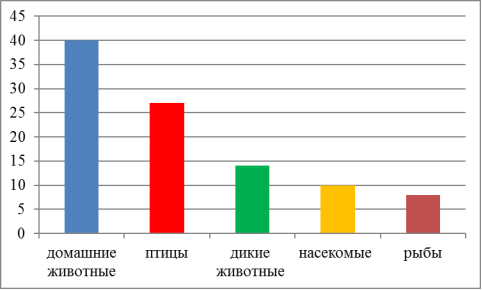Второе место по частоте упоминания занимают птицы — 27 %, третье место — дикие животные — 14 %, четвертое — рыбы 10 % и насекомые — 8 %.