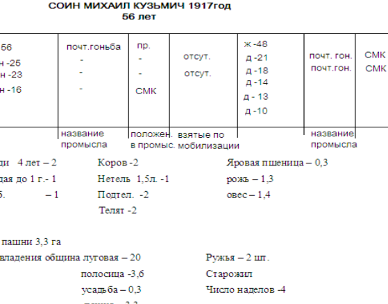 Из данных записей видно, что у моего прапрапрадеда Соина Михаила Кузьмича, в возрасте 56 лет, было трое сыновей и пять дочерей. Основным его промыслом была почтовая гоньба, так же занимался земледелием, скотоводством и подсобным промыслом: охотой, рыболовством. Две его старшие дочери, тоже возили почту.