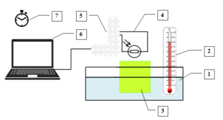 Исследования осуществлялись с использованием экспериментальной установки (Рис.1). Химический источник света (3) в форме куба после активации (смешивания реагирующих компонентов механическим воздействием) помещали в разные температурные условия — в емкость с водой, нагретой или охлажденной до требуемых показателей. При разных температурах измерялась интенсивность хемилюминесценции. Измерения проводились при помощи консольного люксометра (4,5), собранного из электронных устройств на базе ISKRA JS и запрограммированного на языке JavaScript. Данные считывались с помощью приложения на компьютере (6).