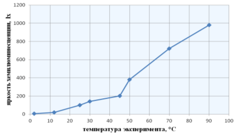 Для каждого температурного режима исследовался новый ХИС, так как интенсивность его свечения зависит от времени начала реакции, и постепенно яркость свечения снижается. Измерение интенсивности хемилюминесценции осуществлялось через 10 минут после активации источника. По результатам эксперимента построен график зависимости яркости свечения от температуры (Рис.2), демонстрирующий, что увеличение температуры реакционной смеси приводит к увеличению яркости свечения ХИС, то есть к усилению хемилюминесценции.
