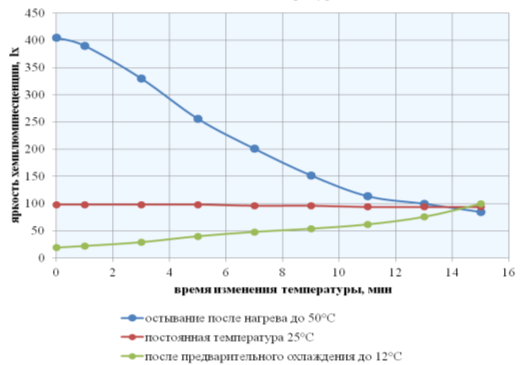 График показывает, что при остывании нагретого ХИС интенсивность хемилюминесценции уменьшалась, а при нагревании остывшего — увеличивалась. Изменение силы свечения происходило за счет ускорения или замедления скоростей протекания химических реакций в источнике света. Следовательно, интенсивность хемилюминесценции непосредственно связана со скоростью реакции, в которой образуется возбужденная частица. А общая скорость реакции хемилюминесценции напрямую зависит от скорости образования продукта реакции, вероятности образования молекулы продукта в возбужденном электронном состоянии и вероятности выхода фотона при переходе возбужденной молекулы в основное состояние.