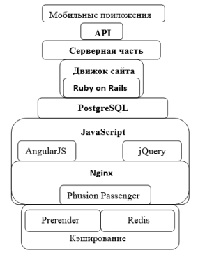 Базовое функционирование сайта обеспечивается благодаря nginx. Nginx [engine x] — это HTTP-сервер и обратный прокси-сервер, почтовый прокси-сервер, а также TCP/UDP прокси-сервер общего назначения. Уже длительное время он обслуживает серверы многих высоконагруженных российских сайтов. [2] Nginx в целом является довольно простым, быстрым и надежным сервером, который не перегружен лишним функционалом, а область его применения целесообразна в первую очередь для статических веб-сайтов. Используя nginx как веб-сервер, мы имеем достаточно много плюсов и обширный функционал, присутствующий здесь в нативном виде. Впрочем, использование его также в немалой мере обусловлено тем, что он также отлично выполняет роль фронтэнда в высоконагруженных проектах. Данный веб-сервер умеет обслуживать статические запросы, индексные файлы, автоматически создавать списки файлов и кеш дескрипторов открытых файлов. Также во встроенных функциях есть акселерированное проксирование без кэширования, простое распределение нагрузки и отказоустойчивость, поддержка кеширования и FastCGI. Помимо этого, нельзя не упомянуть модульность, фильтры, в том числе сжатие (gzip), byte-ranges (докачка), chunked ответы, HTTP-аутентификация, SSI-фильтр. А ещё параллельная обработка нескольких подзапросов на одной странице, обрабатываемая через FastCGI или прокси, поддержка SSL и экспериментальная поддержка встроенного Perl. То есть помимо того, что мы получаем простой, быстрый, не нагруженный веб-сервер, так ещё и получаем достаточно много встроенных функций, за которые на другом веб-сервере отвечали бы ещё пара-тройка отдельных решений, что явно не положительно отразилось бы на производительности и быстроте работы. Ещё стоит упомянуть, что вследствие использования в разработке сайте Ruby On Rails, на nginx установлен Phusion Passenger. Данная связка по итогу обеспечивает максимальную производительность относительно других вариантов сборок веб-серверов и ruby-сервера.
