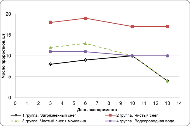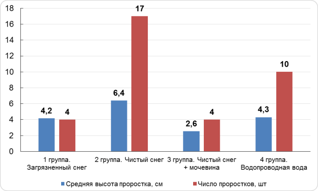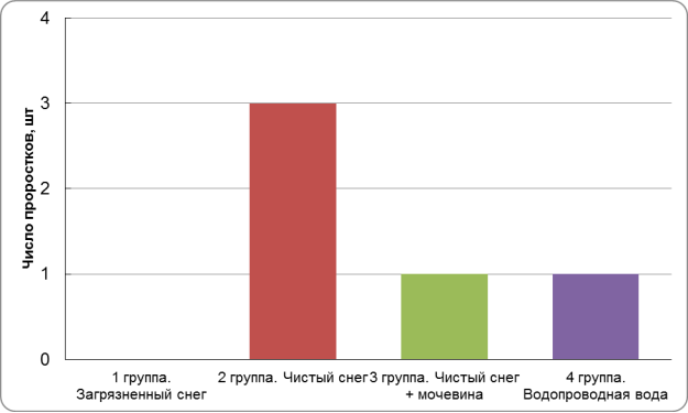 Первую группу растений поливали талой водой, полученной из загрязненного снега, собранного на пр. Лаврентьева. Вторую группу поливали талой водой, полученной из чистого снега. Третью группу поливали талой водной, полученной из чистого снега, с добавлением 1 г мочевины на 1 литр воды. Четвертую группу поливали водопроводной водой.