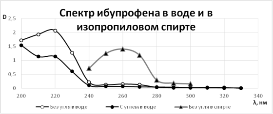Уменьшение оптической плотности в точке максимума поглощения (220 нм) после адсорбции на угле свидетельствует о снижении количества ибупрофена в растворе (Сисх = 1 г/л). Одновременно видно, что спектральные изменения однозначно не вызваны изменением растворителя, так как в этом случае произошел бы сдвиг точки максимума поглощения. Следовательно, немодифицированный уголь способен сорбировать его из водного раствора и практически в два раза снижать его концентрацию. Сорбционная емкость образцов составила по ибупрофену 100 мг/г.