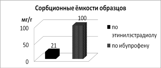 Исходя из данных, приведенных в таблице, сорбционные емкости образцов составили не менее 21 мг/г по этинилэстрадиолу во всех случаях, а их константы связывания достаточно велики. Важно отметить, что константу связывания для активированного угля, окисленного KMnO4, не удалось определить с помощью хроматомасс-спектрометрометрии, так как остаточная концентрация этинилэстрадиола в растворе меньше предела обнаружения прибора.