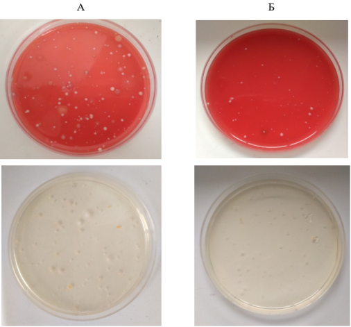 Рис. 2. Чашки Петри, в которых не было чеснока (А) и Чашки Петри с чесноком (Б)