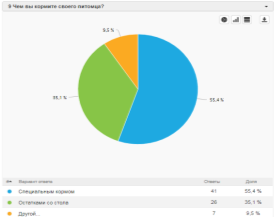 It can be clearly seen that owners worry and care of their pets because 65.5 % treat them as a friend and companion (image 1); 55.4 % answered that they feed them with a special dog or cat food, and 35.1 % make separate food from meat, bones, and groats (image 2). The most popular way of getting an animal is from breeders-55.4 %, 37.8 % took them from animal shelters, while 6.8 % owned them in other ways.