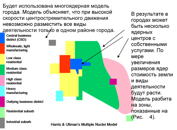 Согласно многоядерной модели, центр города более населен, поскольку в нем сосредоточены все объекты. Бизнес-центры, рабочие места сосредоточены в административном центре Нур-Султана и вызывают перенаселенность.