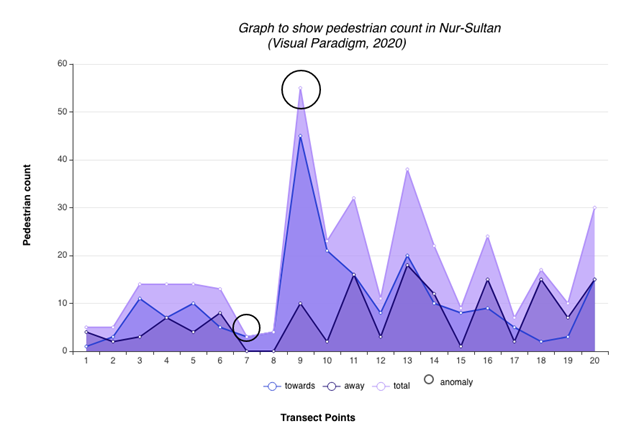 Первая гипотеза гласила: «Перенаселенность увеличивается по мере удаления от старого города» и подтверждается диаграммой площади (рис. 3.2). Тенденция графика показывает резкое увеличение количества пешеходов в точке 9, что свидетельствует о наличии многоядерной модели (Рисунок 1.4) и наличия административного центра. Аномалии на участках с 10 по 20 объясняются назначением построек (рис. 3.7). Следовательно, первая гипотеза принимается.
