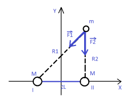Суммарное ускорение планеты, создаваемое системой двух звезд, равно сумме ускорений, создаваемых каждой из звезд в отдельности. Решим задачу о движении планеты в системе координат привязанной к звездам — звезды располагаются на оси OX на равных расстояниях от начала координат.