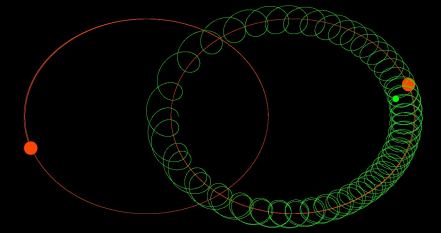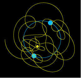 Пример 2. «Перепрыгивающая» планета. Экспериментально полученная траектория, когда планета сначала вращается вокруг одной звезды, через некоторое время захватывается гравитационным полем другой звезды и начинает вращаться вокруг другой звезды, через некоторое время возвращается к первоначальной звезде.