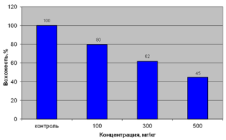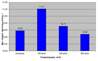 Обобщение результатов проведенных исследований позволяет сделать заключение о наличии стимулирующих эффектов противогололедных материалов в концентрациях 100 и 300 мг/кг почвы, а также о наличии угнетающих эффектов ПГМ в концентрациях выше 500 мг/кг. Это говорит о том, что применение ПГМ на территориях города в концентрациях выше 500 мг/кг почвы приведет к угнетению биомассы.