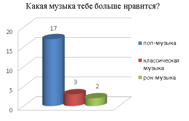 Вывод: большей части одноклассников нравится слушать музыку, их настроение меняется. Мы выяснили, какие музыкальные стили привлекают детей: большинство — слушают поп-музыку. Дети считают, что музыка может влиять на организм человека. Мы решили провести эксперимент и наглядно в этом убедиться.
