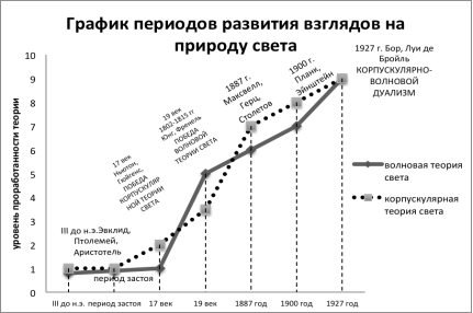 Мы представили основные этапы развития представлений о природе света в виде графика, на котором видна историческая преемственность в поступательном движении человеческой мысли (рис. 1).