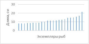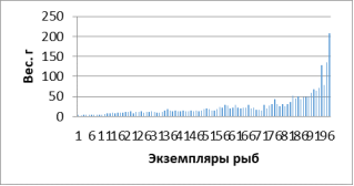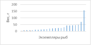В декабре 2021 г. были проведены измерения пластических характеристик ротана — длина, вес [2]. Исследованы 33 экземпляра, пойманных в оз. Море с мая по ноябрь 2021 г. Возраст особей, определялся по отолитам.