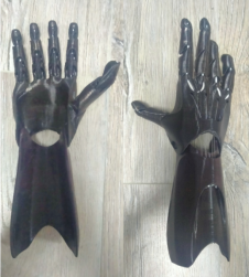 Выполнив анализ лицензий для некоммерческого использования и последующего изменения модели, была выбрана модель активного протеза In Moov французского дизайнера Гаэля Лангвини (Gael Langevin) http://inmoov.blogspot.com, http://www.inmoov.fr. В модели были заменены металлические штифты на пластиковые втулки для уменьшения массы модели и возможности использования в воде (без электронного оборудования и аккумуляторов). Для этого прототипа был выбран пластик PET-G телесного цвета.