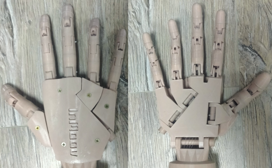 В разработанной и изготовленной конструкции протеза кисти для более комфортного и функционального её использования, по сравнению с активным протезом, обладает сервоприводами, что позволяет сгибать ладонь протеза за счёт электроники.
