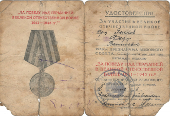 Тяжелые годы 1941–1945 гг. Весь народ — и стар, и млад, встали на защиту своей Родины. «Все для фронта! Все для победы!» — этот лозунг военного времени требовал огромной работы, полной отдачи сил от каждого. Мой прадедушка Федор Васильевич с 1 августа 1941 года по ноябрь 1941 был мобилизован Закаменским РВК в 32 артиллерийский стрелковый полк. В ноябре 1941 — ноябрь 1942 переведен в артиллерийский полк. В сентябре 1942 году был ранен в ногу. С июля 1942 — август 1942 переведен в 70 Гвардейский артиллерийский полк. С августа 1942 года по декабрь 1945 был в Гвардейском пушечном артиллерийском полку. В 25 сентября 1945 году демобилизован на основании указа Президиум Верховного Совета СССР.