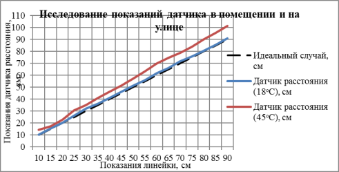 Чтобы оценить точность измерения используемого в работе датчика мы провели эксперимент. С помощью демонстрационной линейки измерили показания датчика в помещении (18°С) и на улице (45°С). Атмосферное давление 764 мм.рт.ст. Результаты измерений показаны на рисунке 2.