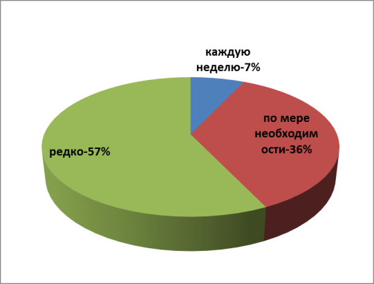 «Как часто вы посещаете библиотеку?» ответили: «каждую неделю» – 7%; «по мере необходимости» – 36%; «крайне редко» – 57%.