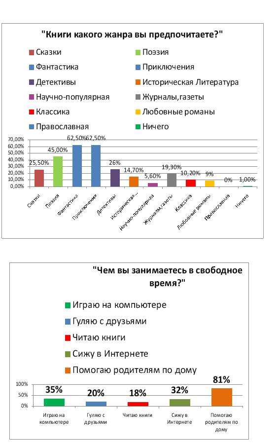 Рис. 5 и 6. Показания социологического опроса «Книги какого жанра вы предпочитаете?» и «Чем вы занимаетесь в свободное время?»