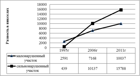 2. Для мало нарушенного участка гари переход между классами составил 17 %. В 1995 году было 50 %, в 2011году стало 33 %.