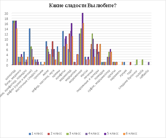 Шоколад является одним из самых любимых угощений для сладкоежек, так считает 97 из 120 опрошенных школьников. Основным конкурентом шоколада является мороженое, его выбрали 88 из 120 опрошенных, также наиболее любимыми сладостями оказались мармелад (63 из 120) и конфеты (56 из 120).