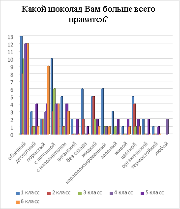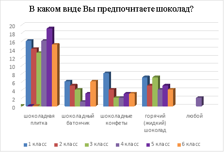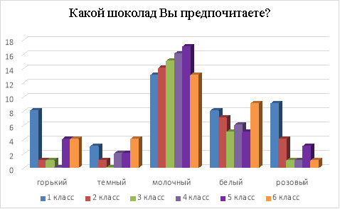 Среди опрошенных школьников самым любимым оказался молочный шоколад, ему отдали предпочтение 67 из 120 прошедших анкетирование.