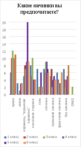 Самыми любимыми начинками оказались: карамель/«взрывная карамель» 58 из 120 опрошенных школьников, орехи (49 из 120) и печенье (44 из 120).