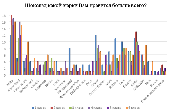 Самыми популярными марками шоколада у школьников оказались Milka, ей отдали свое предпочтение 93 из 120 опрошенных и Alpen Gold — 63 из 120 опрошенных.