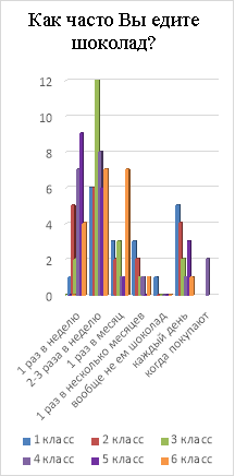 Самым популярным ответом о частоте употребления шоколада оказался вариант — 2–3 раза в неделю, такой вариант ответа выбрали 45 из 120 школьников.
