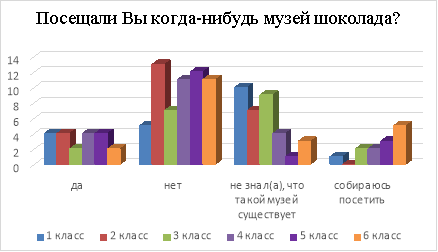 На вопрос посещали Вы когда-нибудь Музей шоколада, большинство опрошенных ответили отрицательно — 59 школьников и 34 школьника не слышали, что такой музей существует.