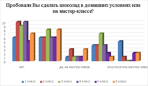 Среди опрошенных оказалась небольшая разница между теми, кто не пробовал сделать шоколад дома или на мастер-классе 47 из 120 участников анкетирования и теми, кто пробовал сделать шоколад дома — 40 из 120 школьников.
