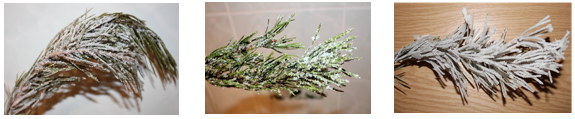 Затем мы решили сделать снег, приготовив концентрированные растворы соли, соды и сахара [2, 136]. Окунаем ветви сосны в горячий раствор и оставляем на некоторое время, затем даем им сохнуть. Этот эксперимент лучше проходит с использованием крупной соли, тогда кристаллы получаются более эффектными.