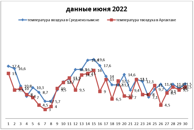 : в течение июня месяца наблюдаются положительные температуры. В с. Аргахтах температура воздуха опускалась до 0