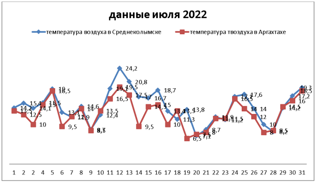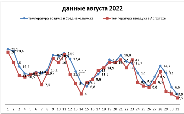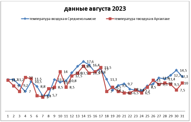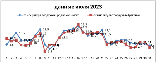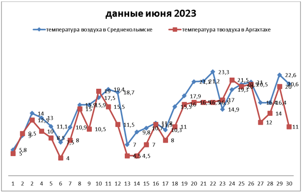 Летом наиболее высокие температуры наблюдаются в г. Среднеколымске, т. к. она расположена южнее от с. Аргахтах. Июнь, июль месяцы 2023 года теплее, чем 2022 год. Месяц август теплее в 2022 году, чем 2023 году.