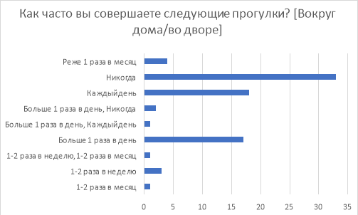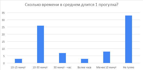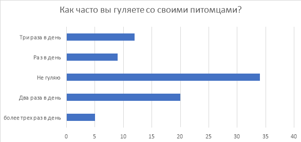 Как мы можем заметить, большинство владельцев не гуляют со своими питомцами, так как те, кто ответил «Не гуляю», являются владельцами кошек, попугаев и других животных, не требующих прогулки с ними. Среди владельцев собак большинство гуляют с собаками 2 раза в день 10–30 минут, и в целом это хороший показатель.