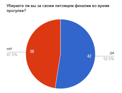 Далее, по ходу опроса я задала вопрос «Убираете ли вы за своим питомцем фекалии во время прогулки?», на который можно было ответить да/нет. Ответы приведены ниже.